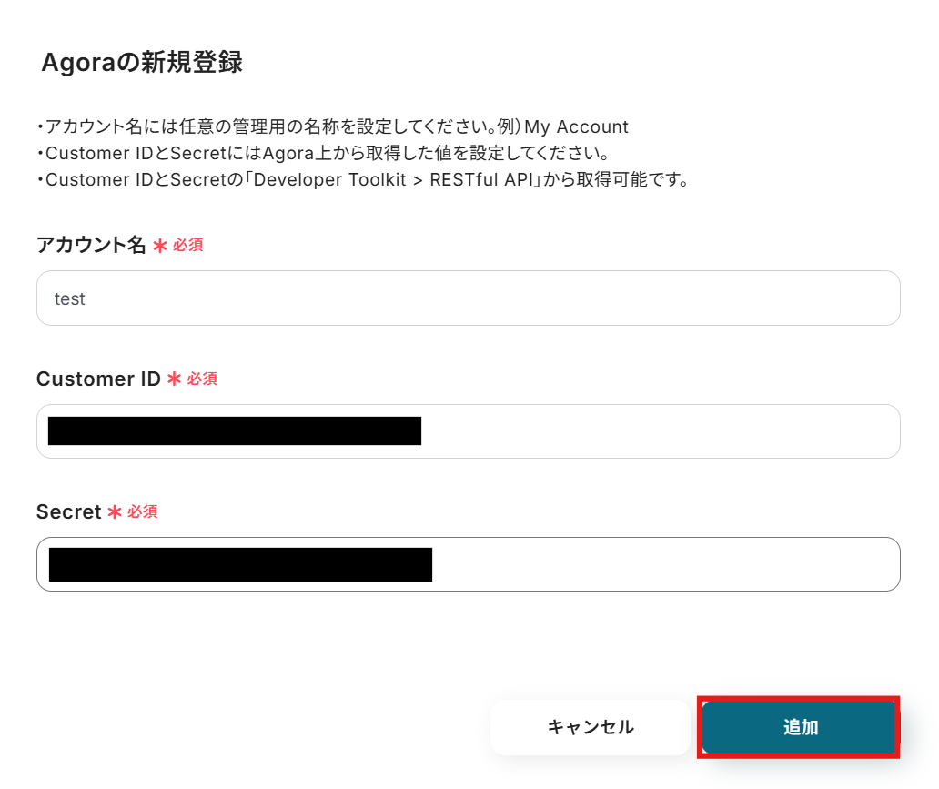 画面の案内に沿って、アカウント名とCustomer ID、Secretを入力します。