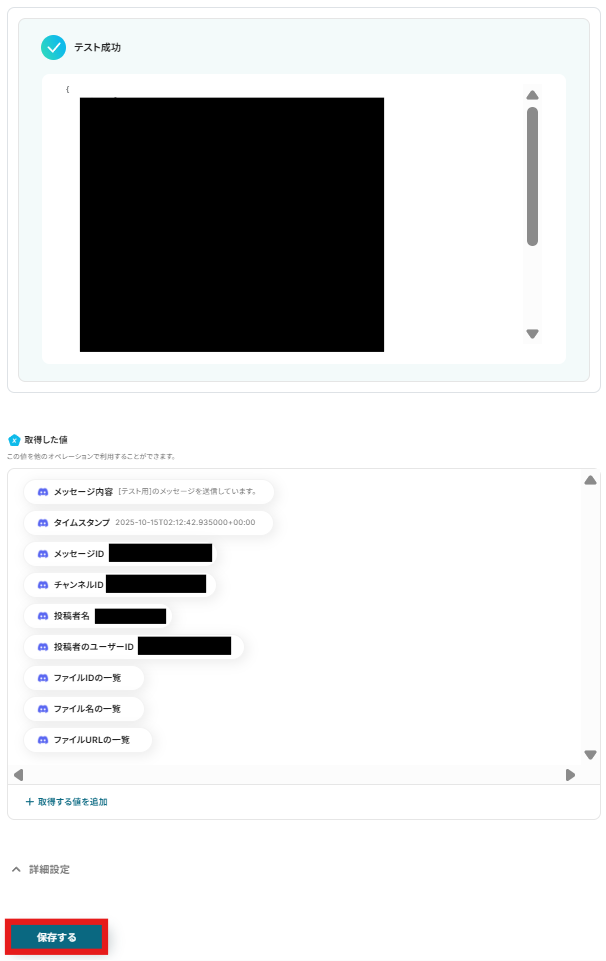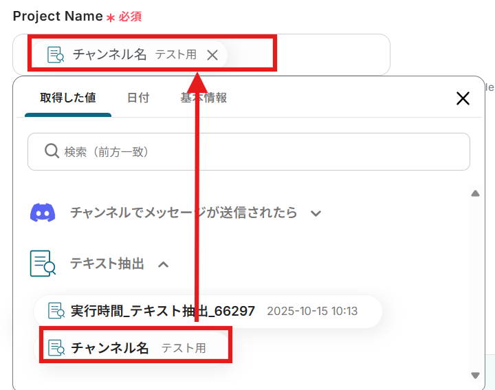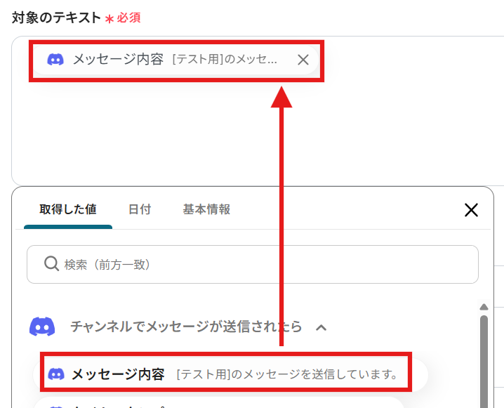 入力欄をクリックすると選択肢が表示されますので、先ほどDiscordのトリガー設定で取得した値の中から選びましょう。