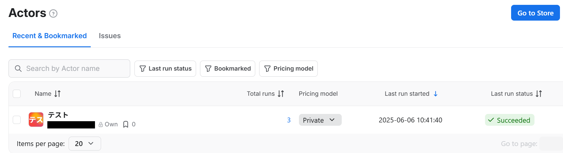 なお、今回はテストとしてApifyでActorを動かすために、事前にApify上で専用のデータベースを準備してあります。