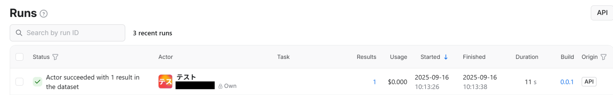 テスト後は、きちんとApifyの画面で実行されているか確認しておくと安心です。