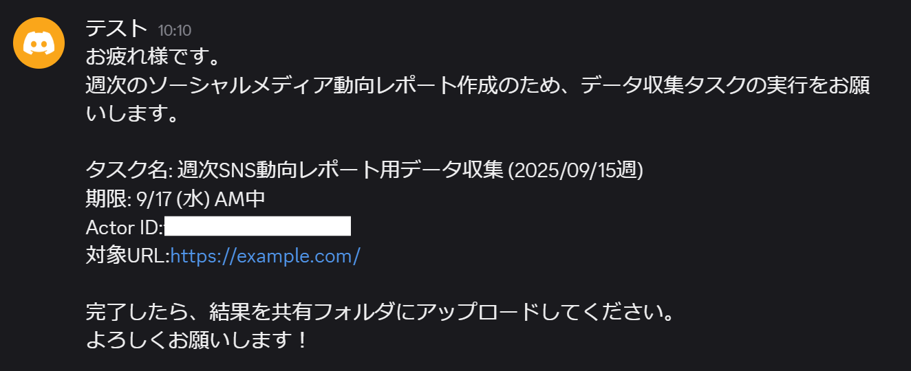 今回は利用するActorがURLを必須項目としているため、Discordのメッセージにテスト用のURLを含めて送信しました。