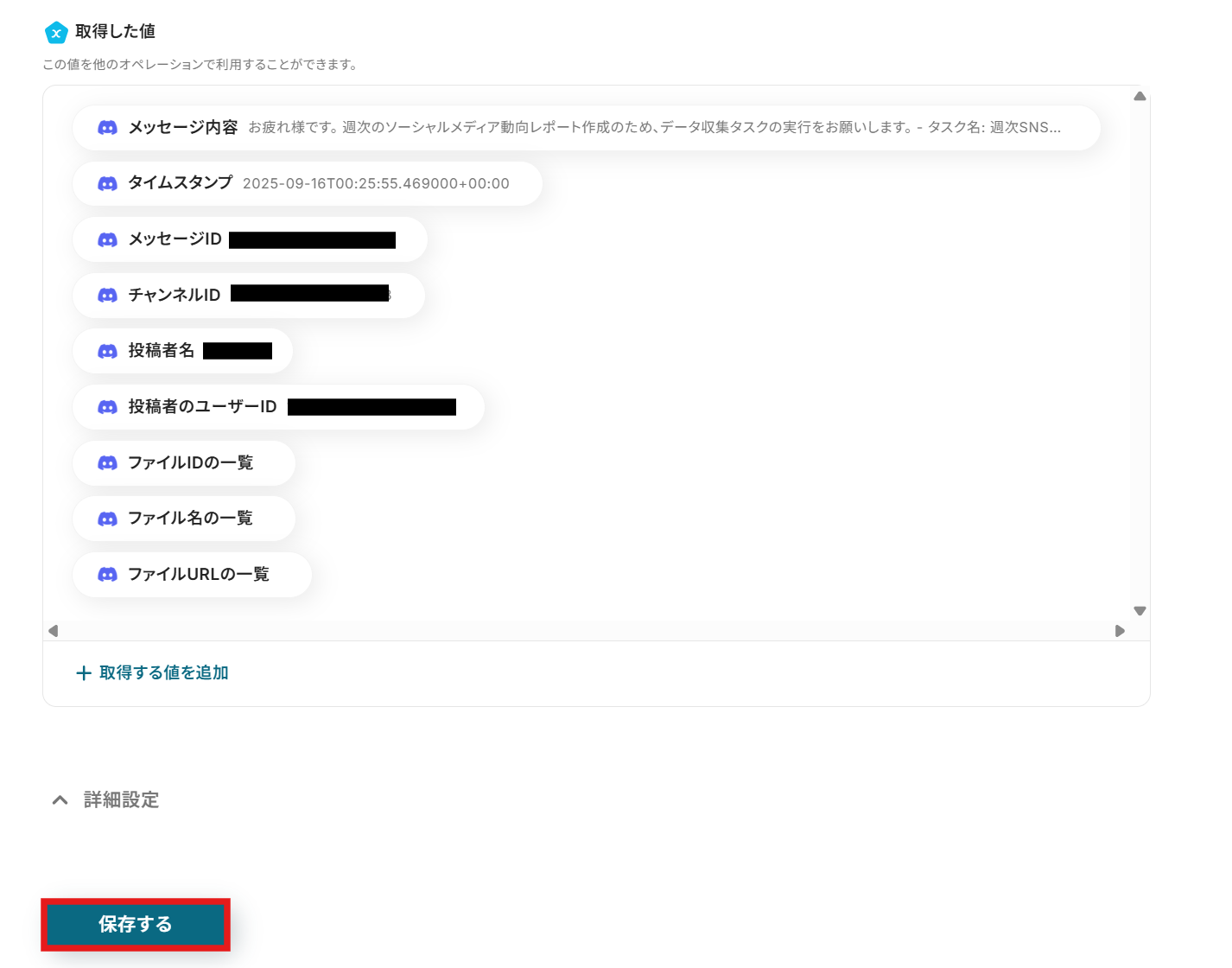 テストが成功すると、「テスト成功」という画面が表示され、Discordから取得した情報をYoomで引用できるようになります。