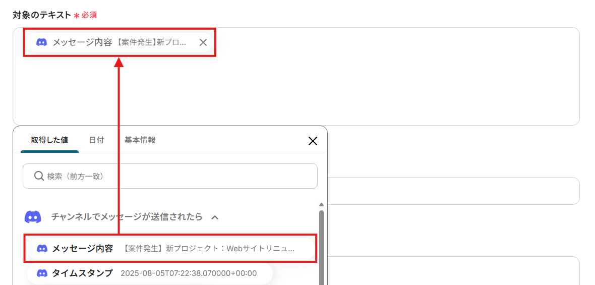項目をクリックすると、入力欄に{{項目名 取得した値}}という形で追加されます。