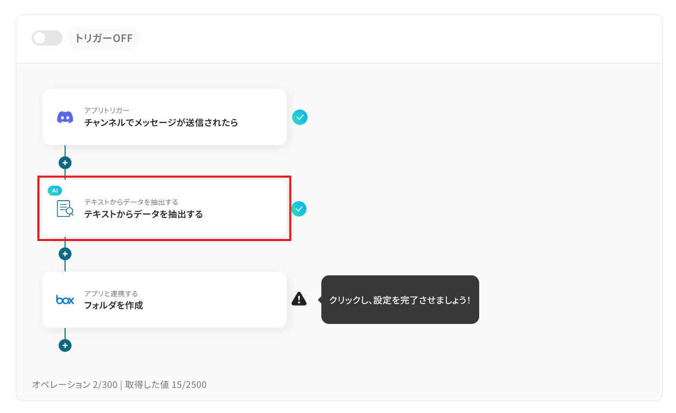 - Discordのトリガー設定と各アクション(データ抽出・フォルダ作成)の設定