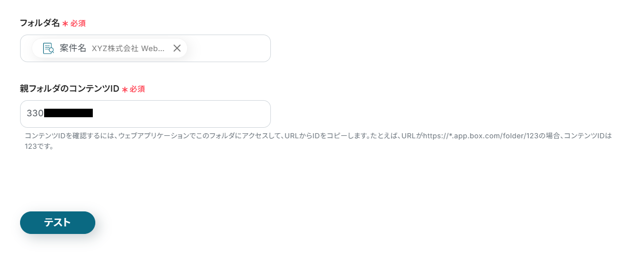 - テストに成功すると、Boxの指定した親フォルダに新しいフォルダが作成されます。