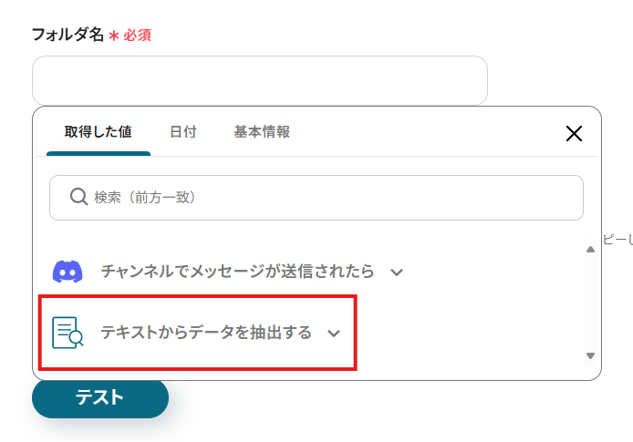 入力欄クリック時に表示されるデータ抽出アクションのメニューから、抽出した値を選択できます。
