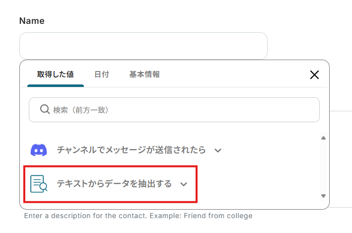 データ抽出アクションで抽出したデータだけでなく、トリガーアクション(Discord)で取得した「投稿者名」などもFrontに連携することが可能です。