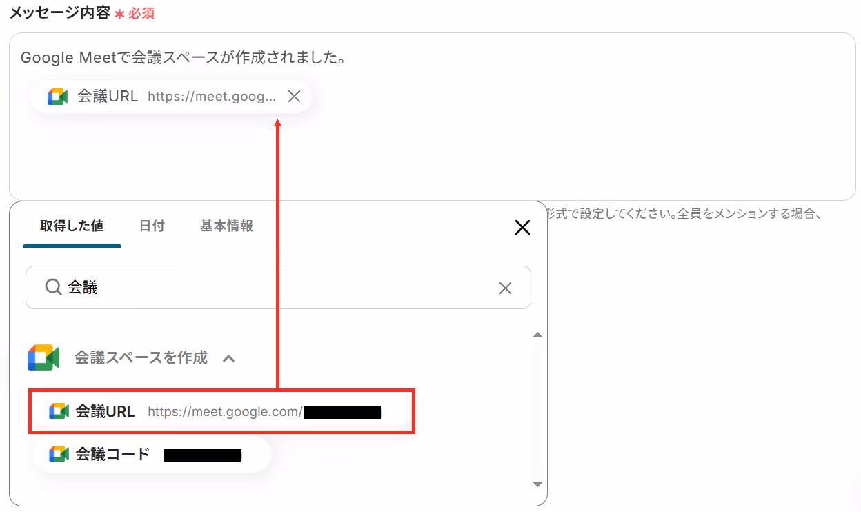 先ほどの特定チャンネルでの投稿をトリガーに、今度はGoogle Meetで会議を作成します。