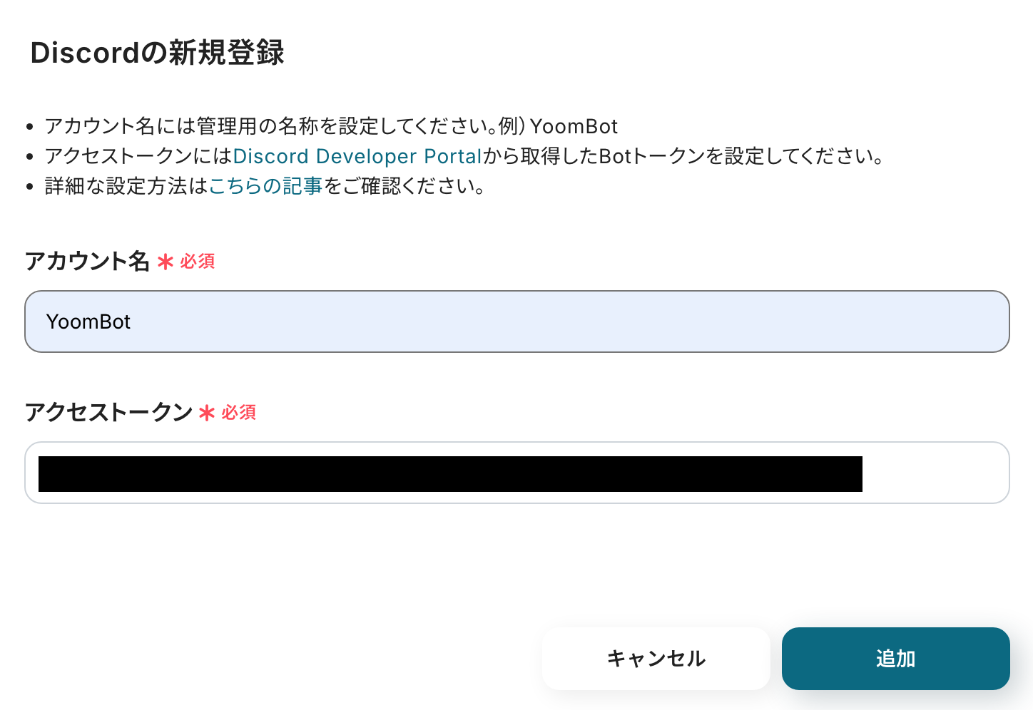 以下の画面が表示されたら、設定方法の詳細を参照しながら、アカウント名とアクセストークンを入力して「追加」をクリックします。