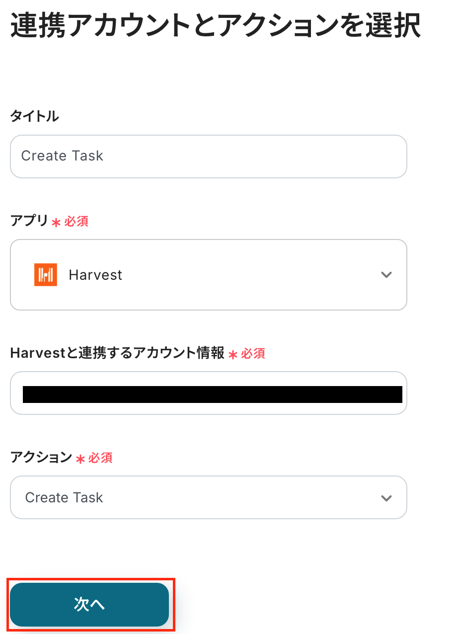 タイトルを任意で修正し、連携するアカウント情報が合っているか確認します。