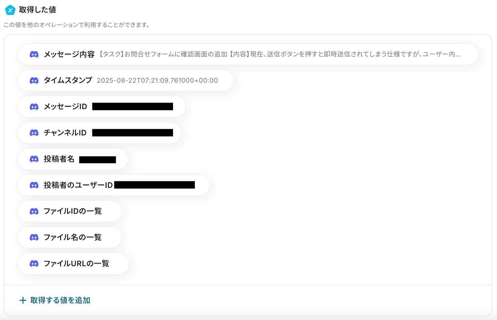 テストに成功すると、Discordで投稿した内容が取得した値(アウトプット)に表示されます。