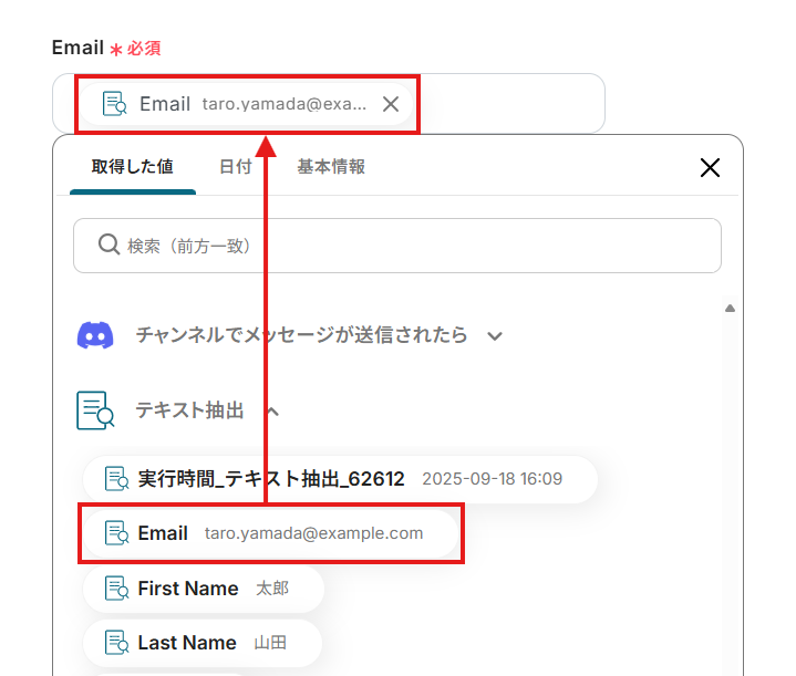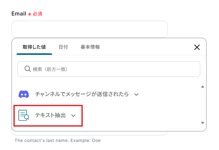 各項目に抽出したデータを設定していきましょう。 入力欄クリック時に表示されるデータ抽出アクションのメニューから、対応する項目を選択してください。 項目をクリックすると、入力欄に{{項目名 取得した値}}という形で追加されます。
