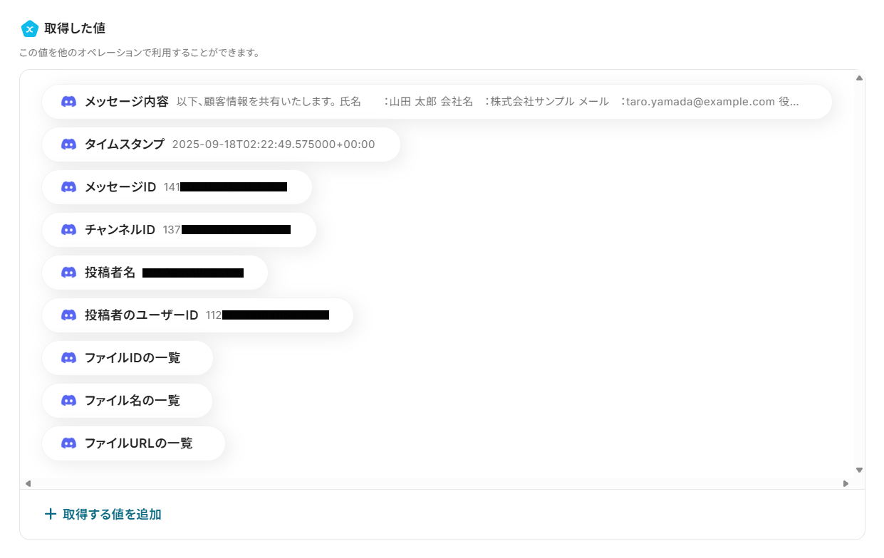 テストに成功すると、「取得した値 」に最新メッセージの情報が追加されます。 これらの値は、以降のアクションで動的な値として使用できるようになります。
