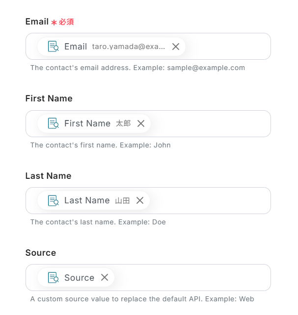 「抽出したい項目」に、コンタクト作成で使う項目を設定。 Loopsのコンタクト作成ではEmailが必須項目 となります。