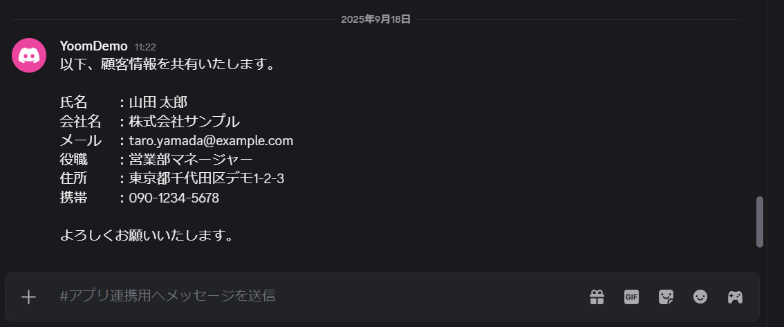 設定を終えたら、Discordの指定したチャンネルにコンタクト情報を含むテスト用メッセージを投稿してください。 ※ テスト用メッセージの例