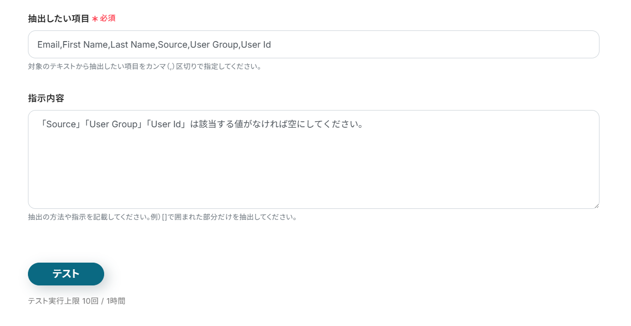テストに成功すると、「抽出したい項目」に設定した項目が対象のテキストから抽出され、「取得した値」に追加されます。 ※ 期待する値が抽出されていない場合には、「抽出したい項目」の名称や「指示内容」を変更して再度お試しください。