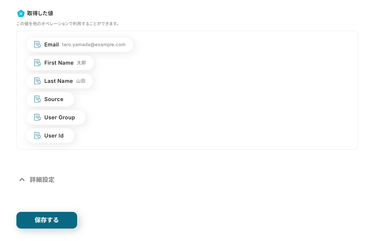 ※取得した値 とは? トリガーやオペレーション設定時に、「テスト」を実行して取得した値のことを指します。後続のオペレーション設定時の値として利用でき、フローボットを起動する度に変動した値となります。
