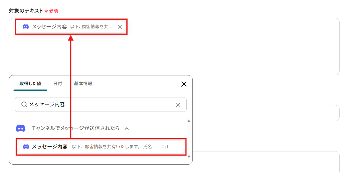 「対象のテキスト」にはデフォルトで、Discordから取得したメッセージが設定されています。 消してしまった場合には、入力欄クリック時に表示されるトリガーアクションメニューから「メッセージ内容」を選択してください。