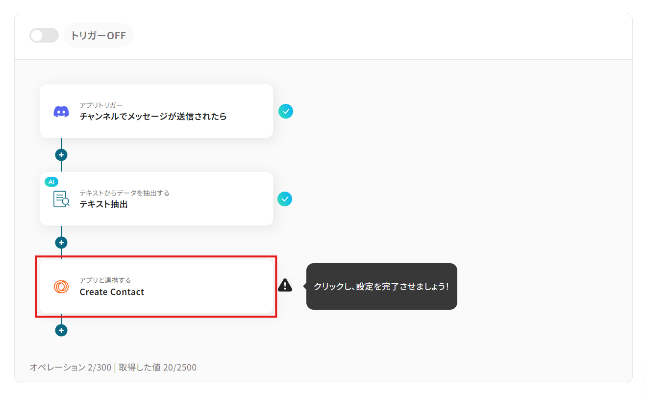 Discordのトリガー設定と各アクション(データ抽出・コンタクト作成)の設定