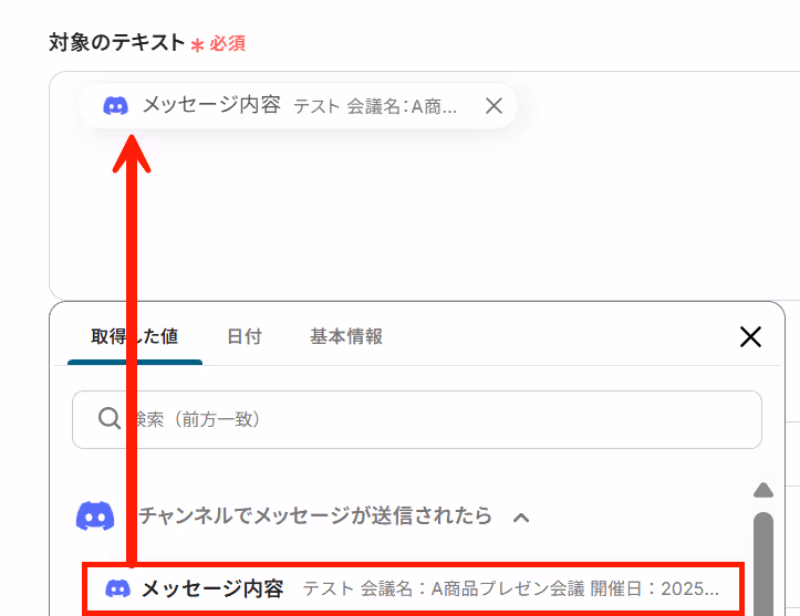 対象のテキストは、前項で取得した値から「メッセージ内容」を選択しましょう。