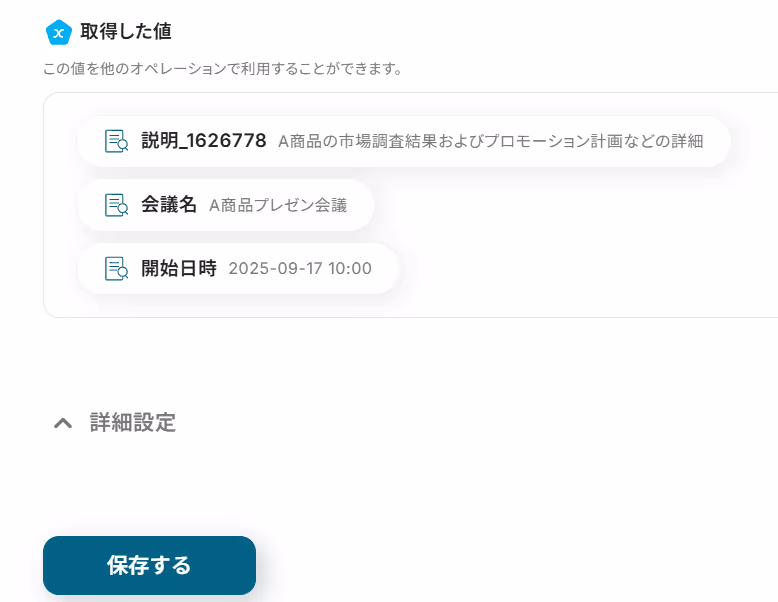 YoomのAI抽出は、会議タイトル、日時、場所などの構造化情報を高精度で抽出するよう設定されています。