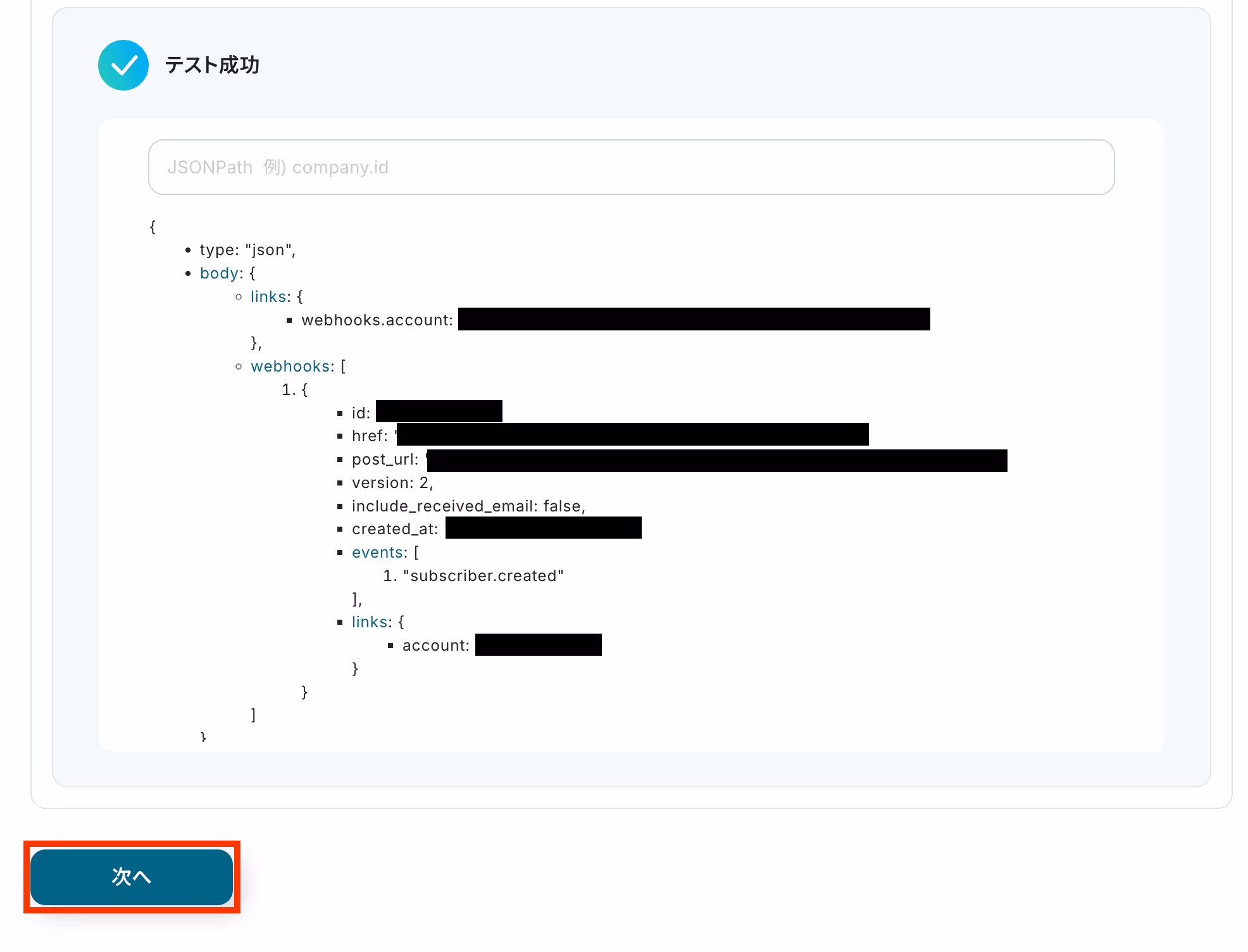 テストに成功したら画面下部の「次へ」ボタンで次のページに進みます。
