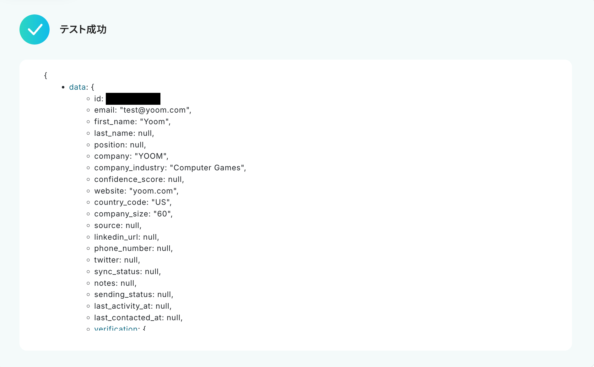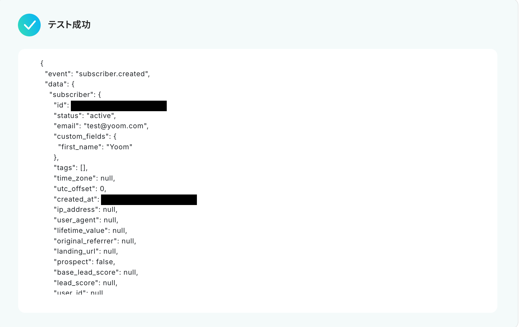 「テスト成功」と表示が出たら、取得した値が取得されます。