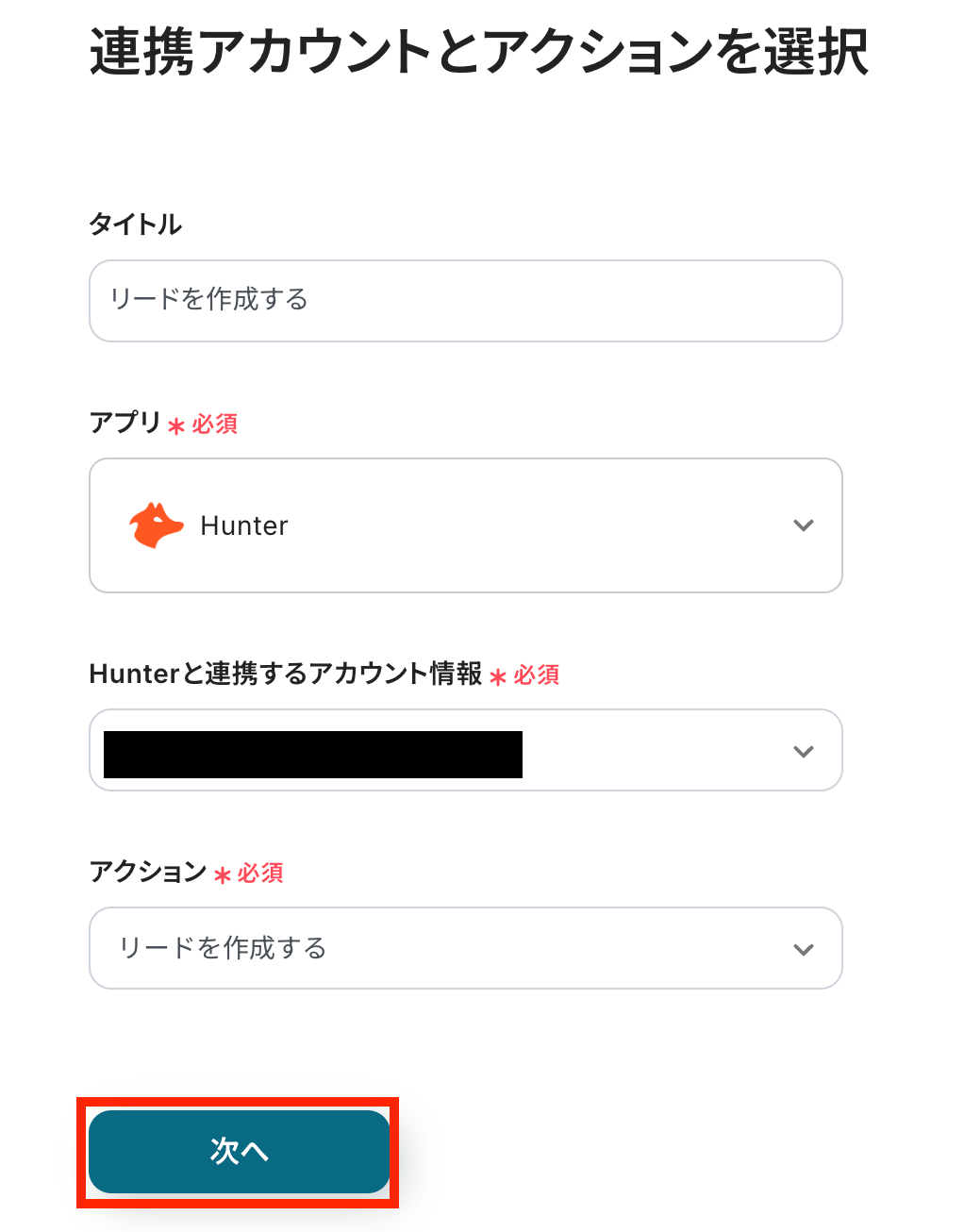 Dripから取得した値を利用して、Hunterにリードを作成する設定を行います。