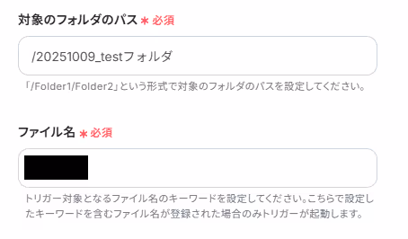 対象フォルダのパスを、記載の形式で入力し、ファイル名も入力してください。
