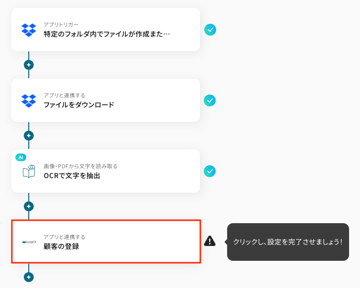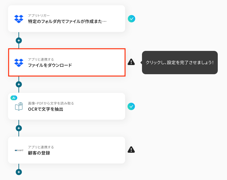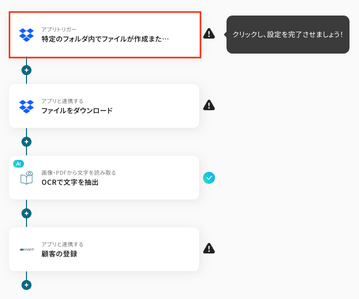 今回は「Dropboxにファイルが格納されたら、OCRで顧客情報を読み取りboardに追加する」フローを作成していきます!作成の流れは大きく分けて以下のとおりです。