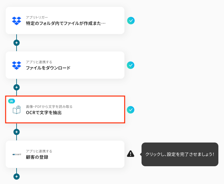 このワークフローを活用すれば、Dropboxへのファイル追加をトリガーとして、OCRがファイル内容を自動で読み取り、その情報を基にTrelloのカードを自動で作成できます。