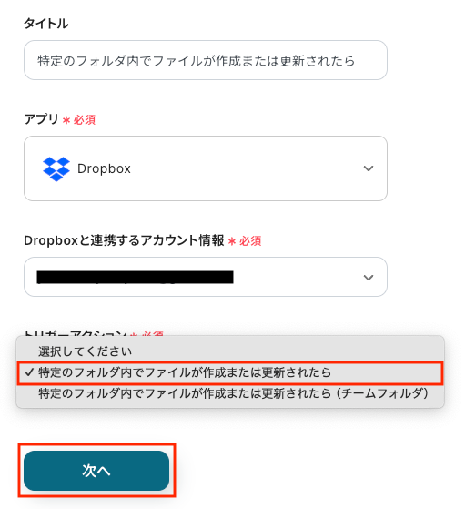 ステップ3:Dropboxのトリガー設定