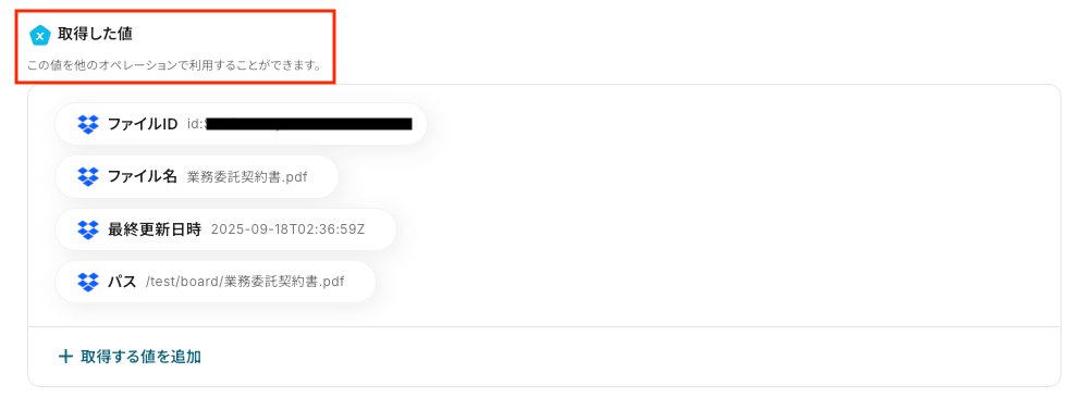 テストが成功すると、以下のように「取得した値」が表示されます。