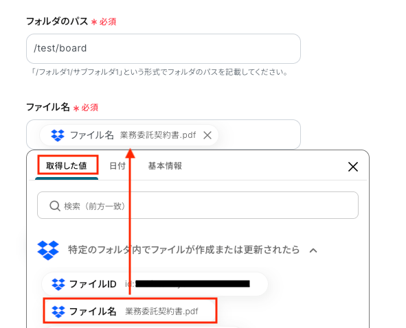 「フォルダのパス」を手動で入力し、「ファイル名」は取得した値から選択します。