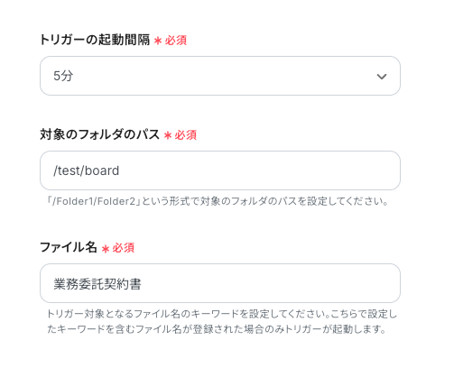 「トリガーの起動間隔」を確認し、「対象のフォルダのパス」「ファイル名」は手動で入力します。