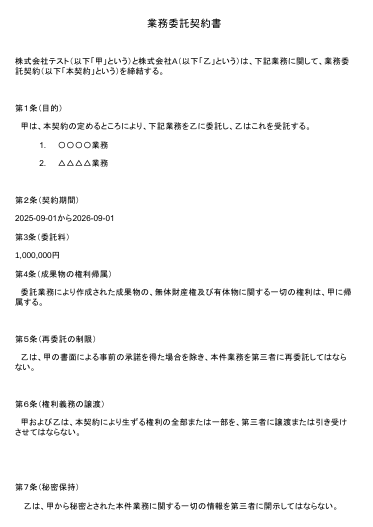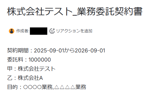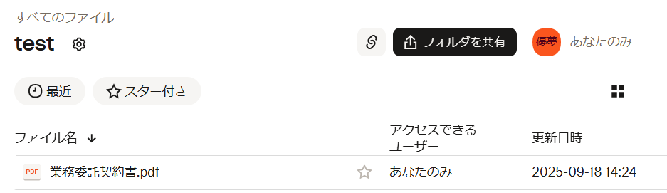 今回は例として「test」フォルダを作成し、業務委託契約書のPDFファイルをアップロードしました。