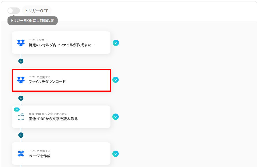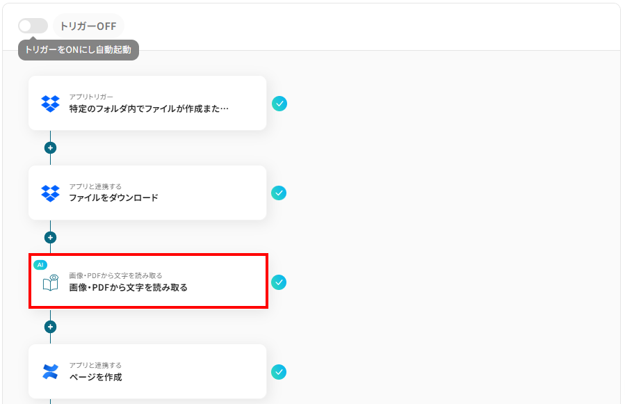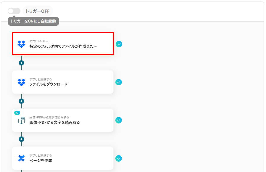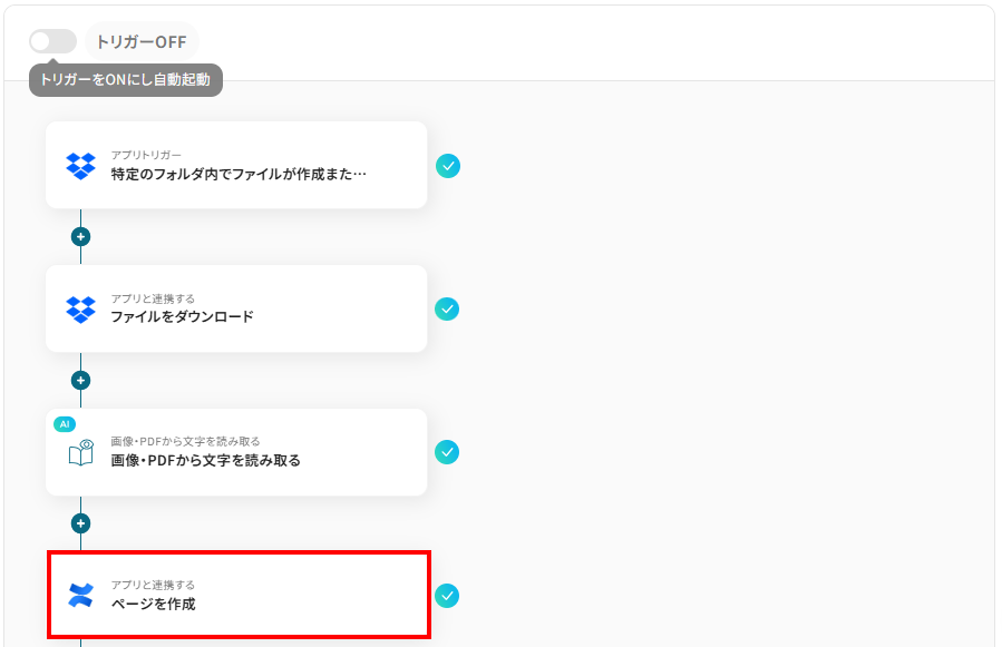 - Dropboxのトリガー設定およびアクション設定、画像から文字を読み取る設定、Confluenceのアクション設定