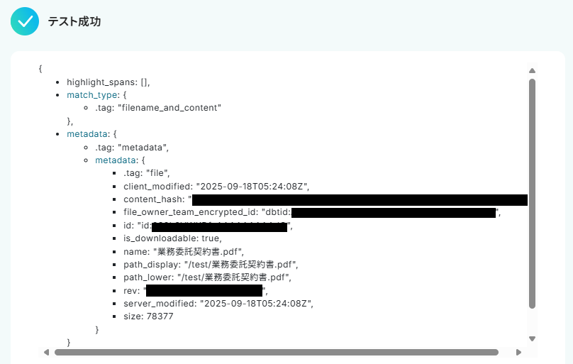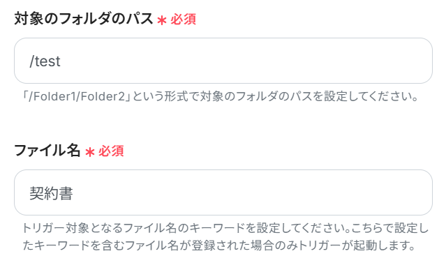 例えば「対象のフォルダのパス」として「/契約書」と入力した場合「/契約書/1月」に格納されたファイルも検知対象です。