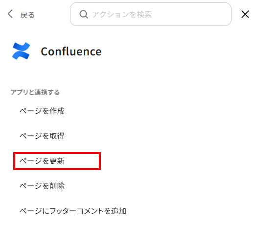 A:Confluenceのアクションを「ページを更新」に変更することで可能です。