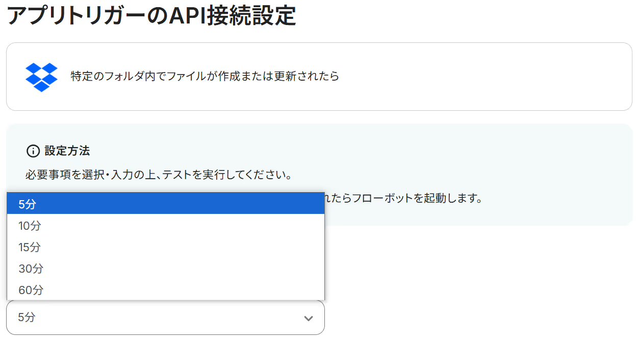 アプリトリガーのAPI接続設定という画面が表示されるので、まずはトリガーの起動間隔をプルダウンから選択してください。