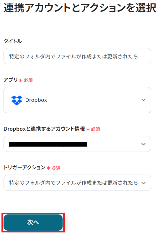 トリガーアクションはテンプレート通りに「特定のフォルダ内でファイルが作成または更新されたら」のまま、「次へ」をクリックしましょう。