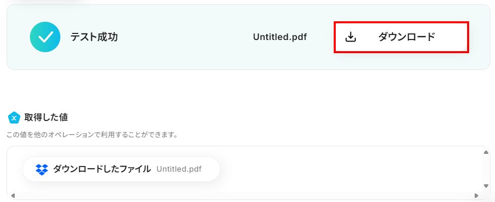 成功すると下記のような画面になり。「取得した値」欄にDropboxの情報が反映されているはずです。