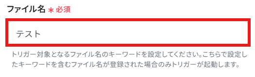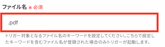 例えばPDFファイルが作成・更新されたときに絞りたい場合は、「ファイル名」に「.pdf」と設定してください。