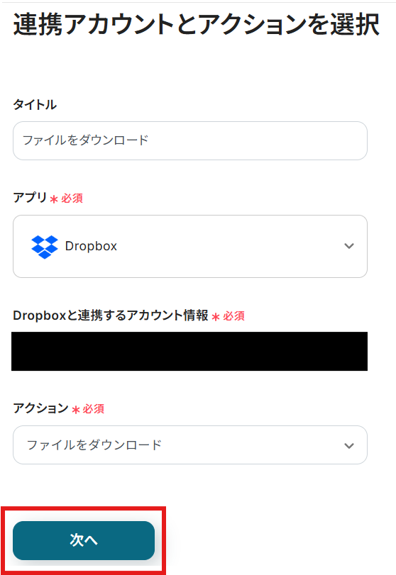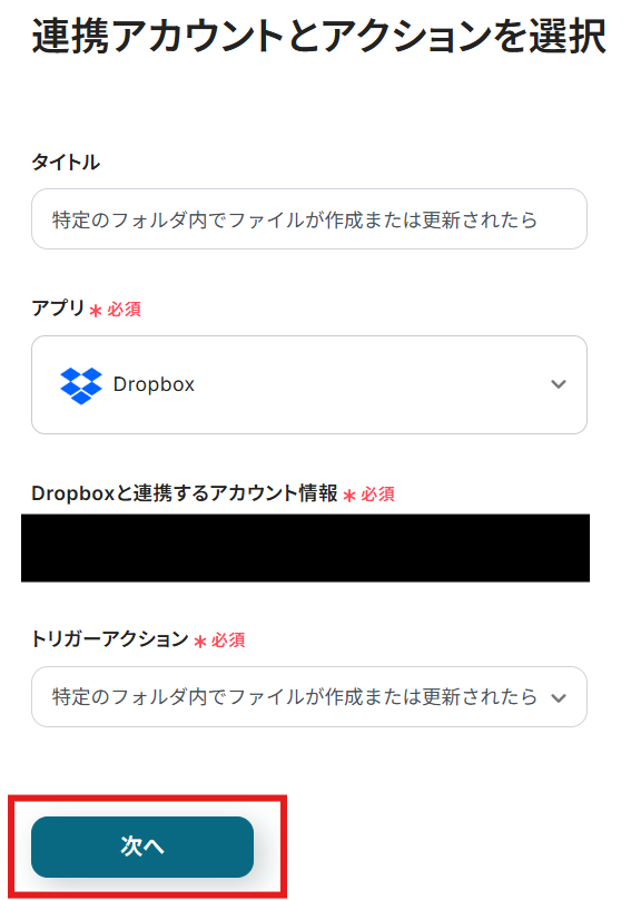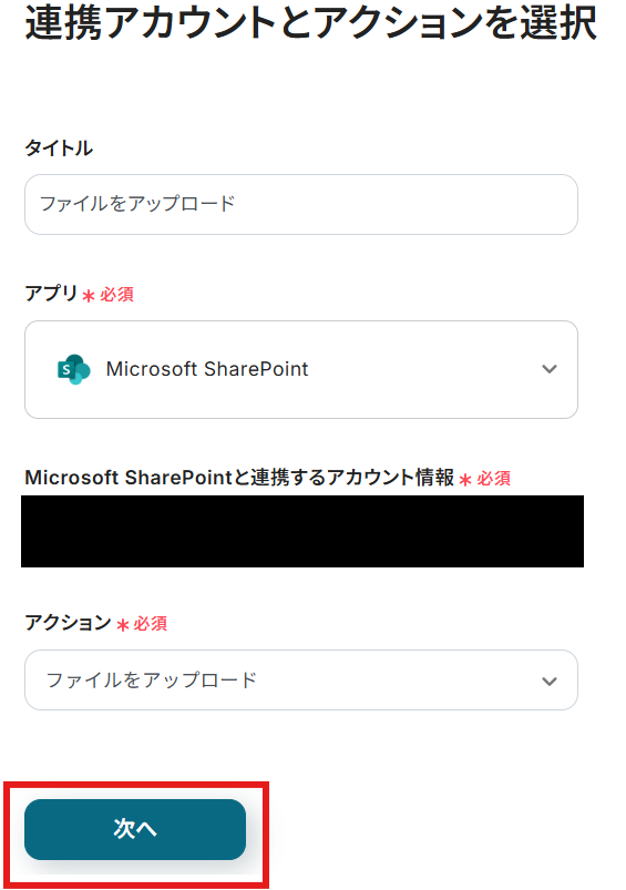 タイトルと連携するアカウント情報を確認し、アクションはテンプレート通りのまま「次へ」をクリックして進んでください。