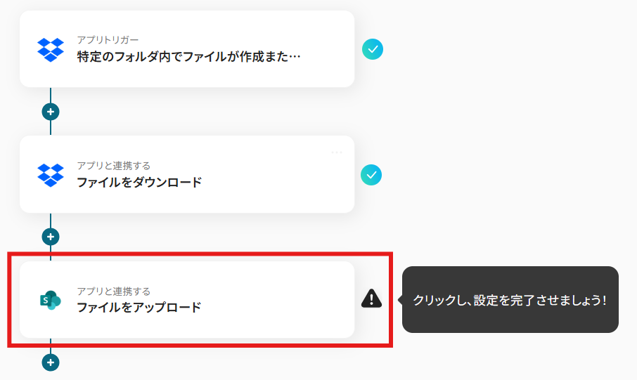 このワークフローを活用すれば、Dropboxへのファイル追加をきっかけに、OCRによるテキスト抽出からMicrosoft SharePointへのファイル格納までの一連の流れを自動化できます。