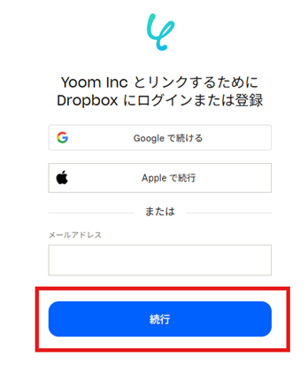 Yoomと連携するアカウント情報を入力し、「続行」を選択します。