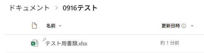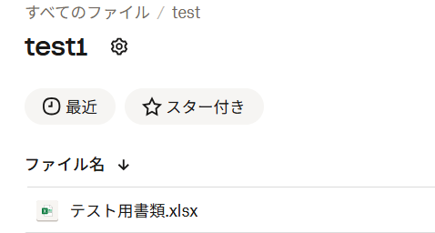 今回は例として「test」フォルダ内にある「test1」というフォルダに「テスト用書類.xlsx」を作成しました!