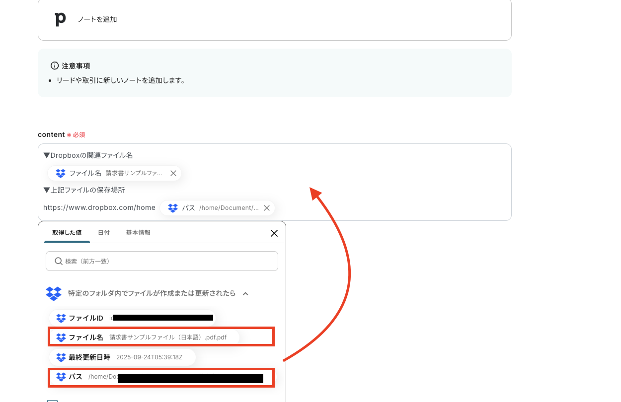 DropboxにアップロードされたファイルをPipedriveの取引情報に直接ファイルとして転送・添付する連携です。