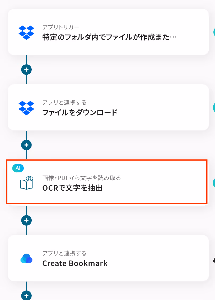 続いて、Dropboxでダウンロードしたファイルに対して、OCRで文字を読み取る設定を行いましょう。