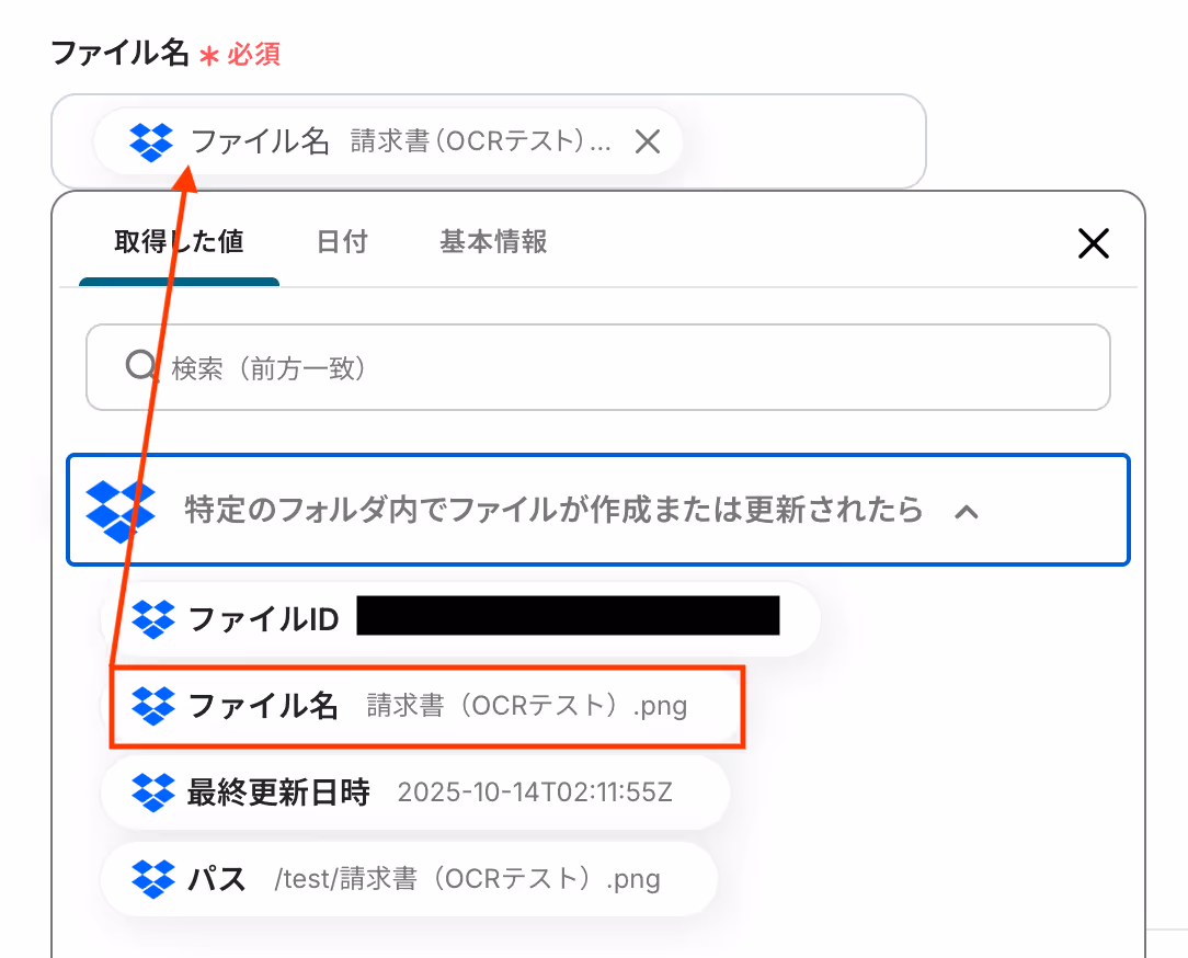入力欄をクリックすると、前のステップでDropboxから取得した値が表示されるので、選択して入力しましょう。